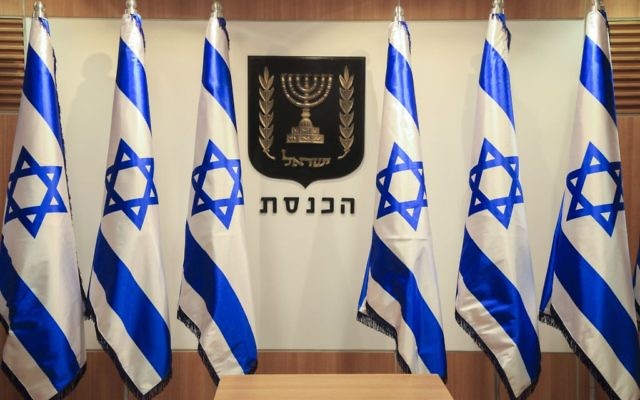 Drapeaux israéliens à côté de la menorah, symbole de l'Etat d'Israël, à la Knesset