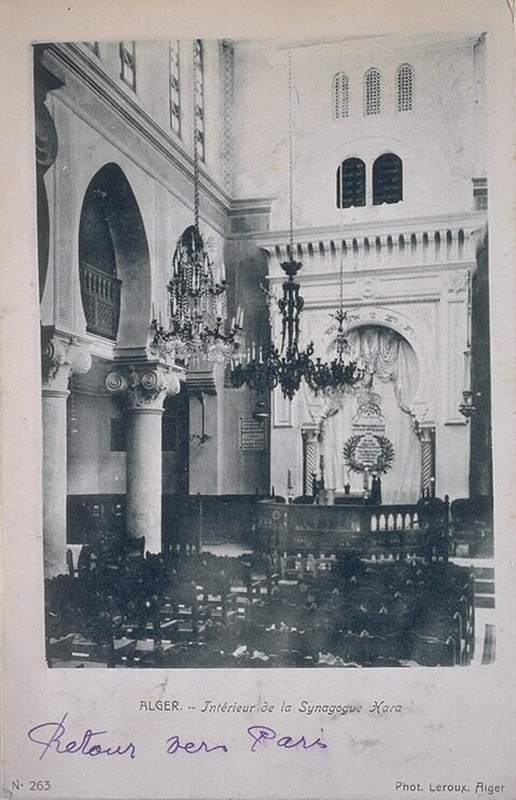 Voilà l’image en persistance rétinienne de ce que mes yeux ont vu jusqu’en 1961, même lorsque jeune professeur, quittant ma classe du lycée Bugeaud le samedi à 10 heures je remontais vers la rue Marengo et descendais jusqu’à la place du grand-rabbin Abraham Bloch où se dresse la grande synagogue inaugurée par l’empereur Napoléon III — l’impératrice Eugénie fit don du grand lustre que l’on voit ici, suspendu au-dessus de ma tête : mon père était heureux que je vienne le retrouver, malgré mes obligations professionnelles, et nous finissions dans les chants et la joie la prière de cha’harit.