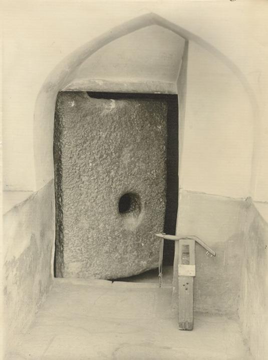 Cette Photographie d'archives de dimensions H. 23,6 - L. 17,4 cm, représente la porte en pierre qui mène aux tombeaux d'Esther et Mardochée à Hamadan (Perse)