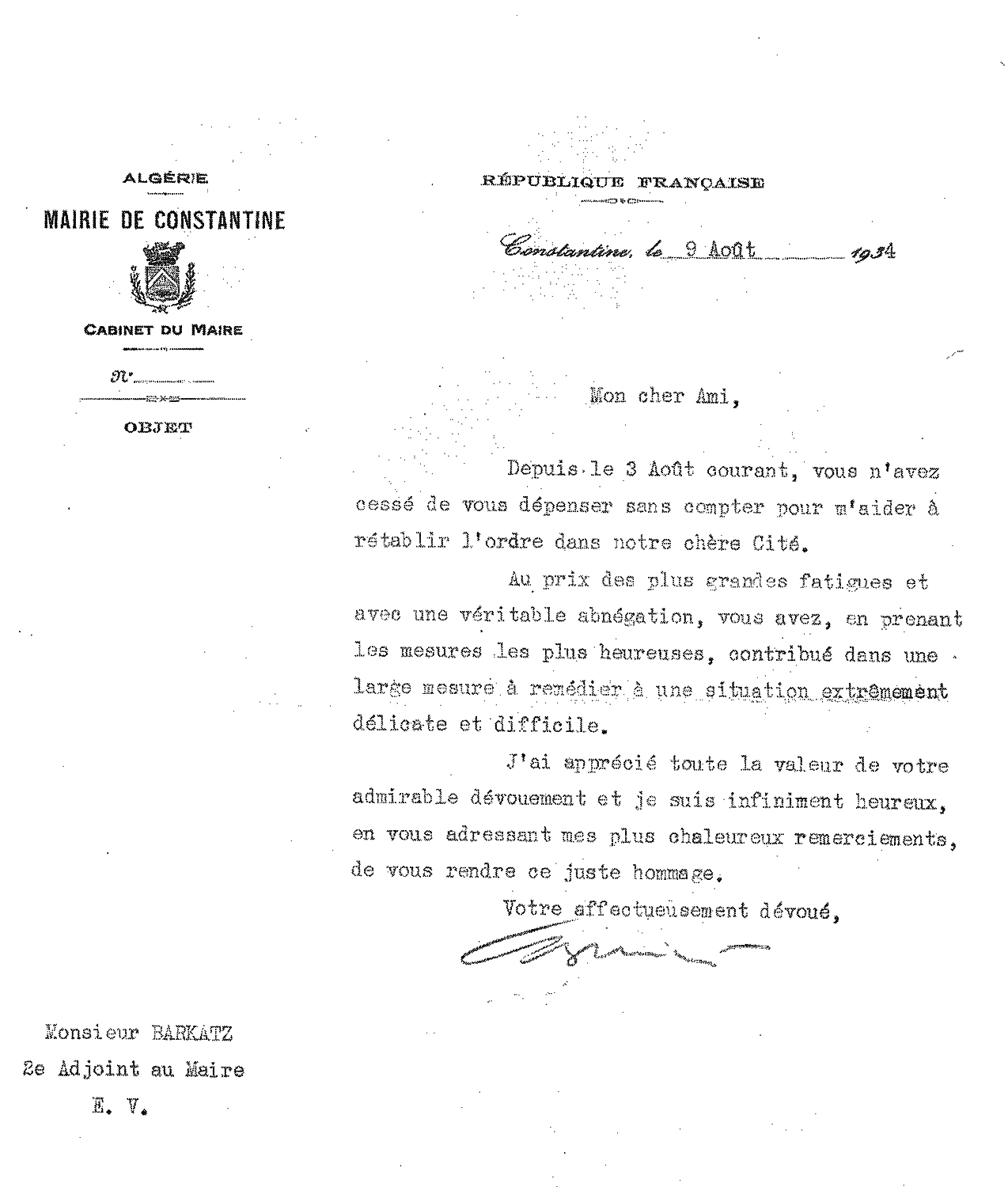 Lettre d’Emile Morinaud, Maire de Constantine *