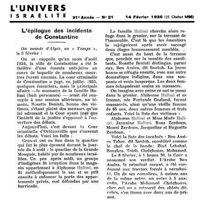 Plus tard, lorsque je fus en âge de comprendre, on m’avait expliqué longuement la tragédie : Des familles d’israélites avaient été égorgées par des émeutiers arabes. Le gouvernement français n’avait rien fait pour arrêter le massacre. J’avais été particulièrement frappée par l’assassinat de toute une famille amie, à l’exception d’un enfant de onze ans, caché par son père dans le grenier de leur maison. Tapit dans les combles, il assistera à la tuerie, hébété sans pousser un cri.