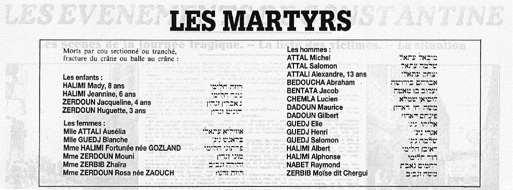 La mort d'un musulman au cours de la répression enflamme les passions et ni les prêches des grandes personnalités juives et musulmanes de Constantine, ni les injonctions des autorités ne permettent d'endiguer la fureur croissante des masses populaires. Le 5 août, des bandes armées investissent le quartier du Marché. Des coups de feu sont tirés et des rixes éclatent en pleine rue. Des émeutiers, qui ont investi des maisons juives, égorgent leurs occupants alors que les soldats et officiers présents sur les lieux restent inactifs, suivant les consignes de non-interventions édictées par leurs supérieurs.