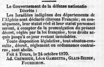 "Les israélites indigènes des départements de l’Algérie sont déclarés citoyens français. En conséquence, leur statut réel et leur statut personnel seront, à compter, de la promulgation du présent décret, réglés par la loi française."