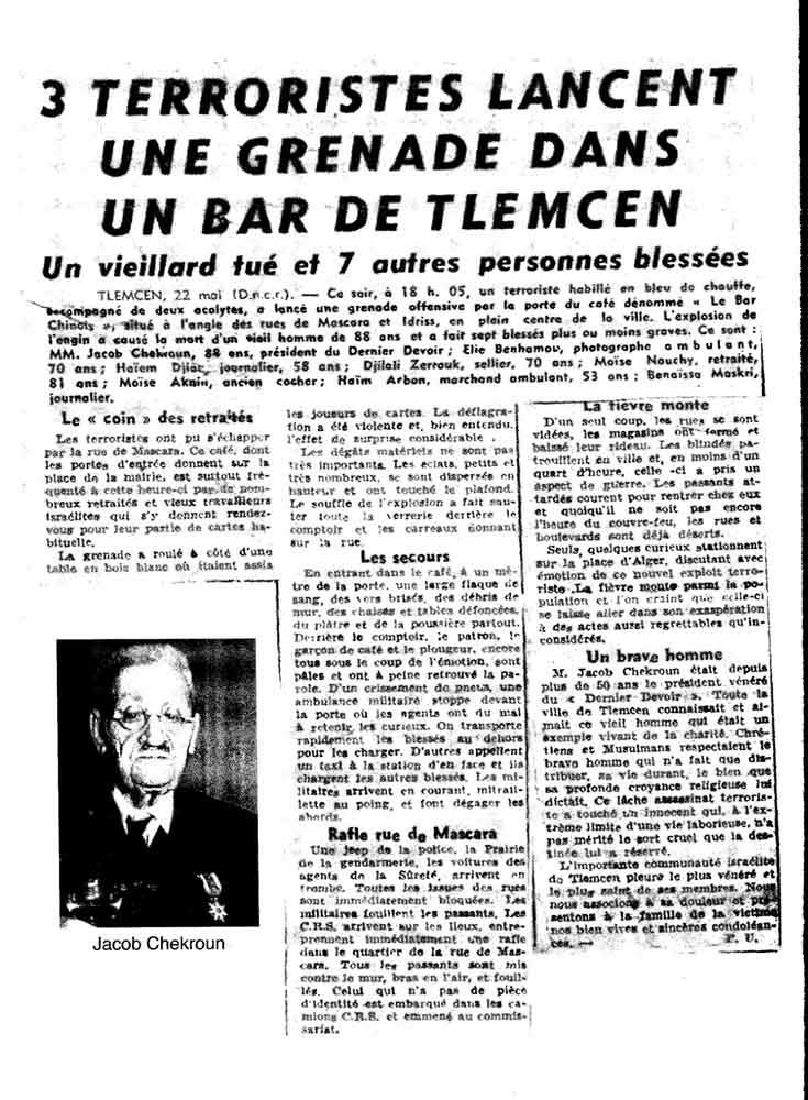 La vieà Tlemcen, présentait de plus en plus de dangers, et les attentats à la bombe ou à la grenade dans les cafés, et les places publiques devinrent monnaie courante. (Photo Victime d’une attaque).