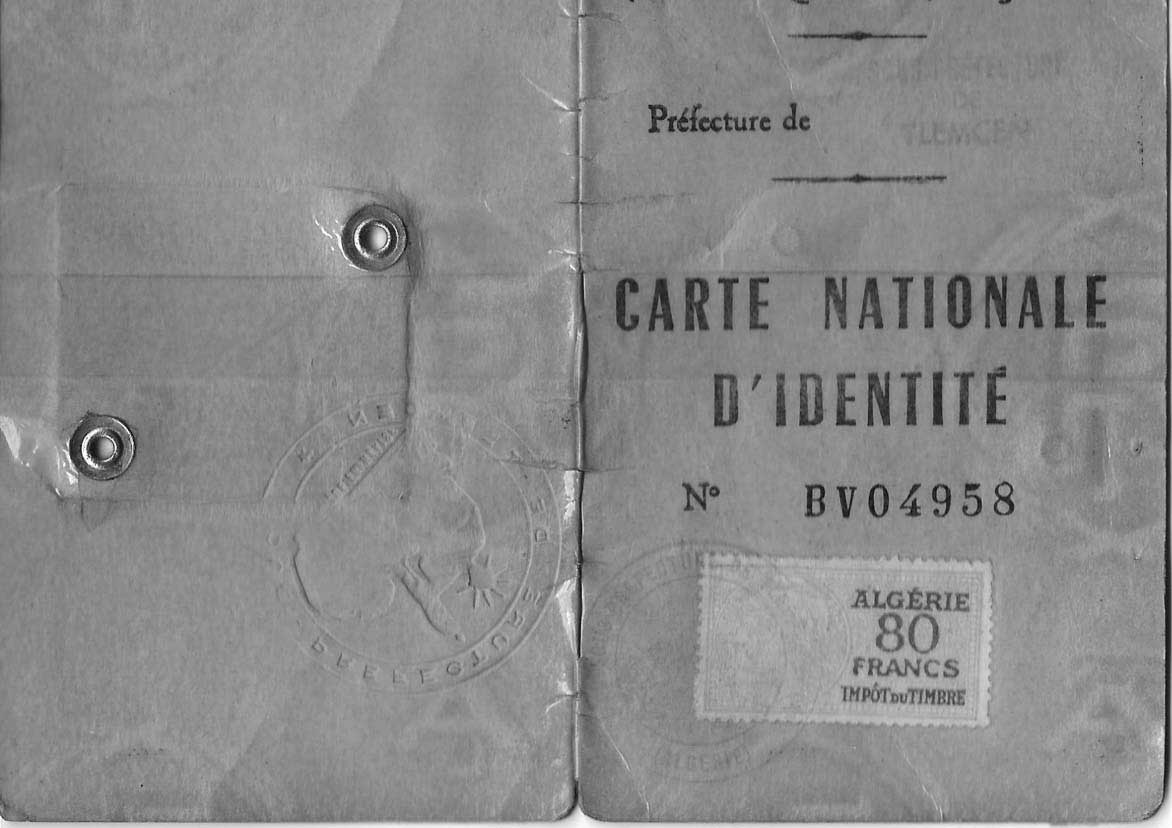 Le Décret qui avait francisé mes arriéres-grands parents, établis en Algérie avant l’arrivée des Français, m’a permis de naitre Français, et d’embrasser la culture francaise sans réservations. (Photo Carte Nationale d’identite).