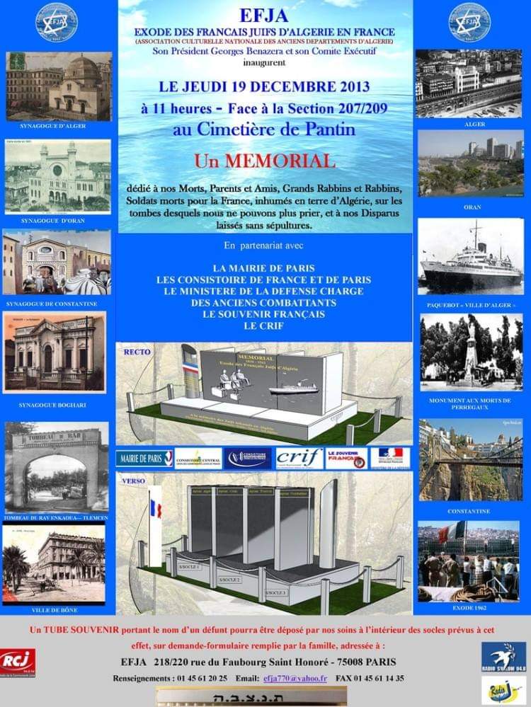 Le 19 décembre 2013 au Cimetière parisien de Pantin, face à la section 207-209, a eu lieu une cérémonie organisée par l’EFJA pour l’inauguration du Mémorial en l’honneur de Français Juifs civils et militaires inhumés en terre d’Algérie.