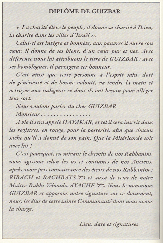 Il est dit, dans ce rapport, que les Guizbarim étaient chargés de distribuer aux pauvres, des aumônes et de la viande, à l'approche des fêtes de Pâque, de Pentecôte et des Tabernacles.