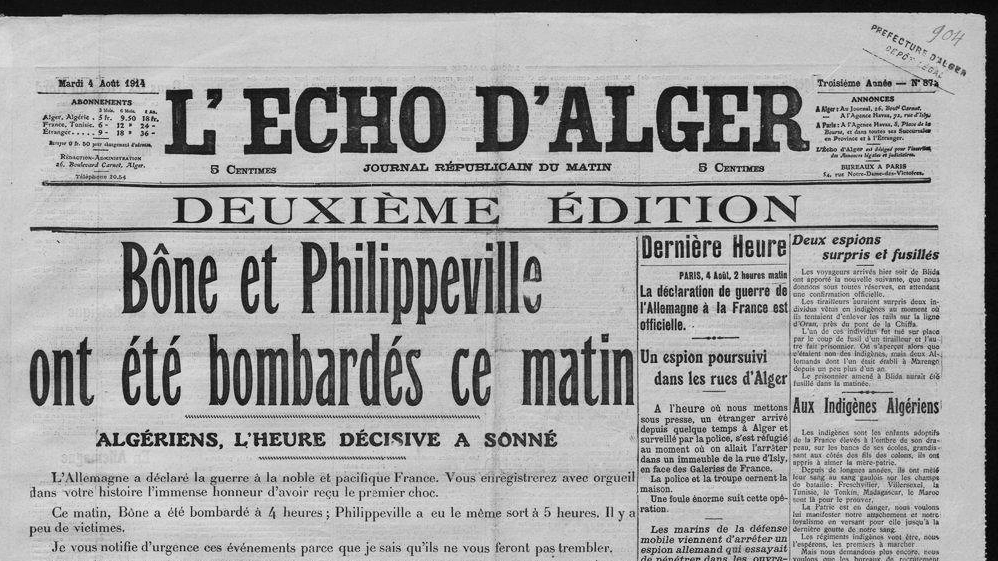 Le 3 août 1914, l’Allemagne déclare la guerre à la France. Le 4 août, à 3h40, sa marine bombarde deux de nos départements français d’Algérie. Les premiers coups de canon de la première guerre mondiale viennent d’être tirés. Sous un titre en gros caractères, l’Echo d’Alger, dans sa deuxième édition, annonce à ses lecteurs une nouvelle stupéfiante : "Bône et Philippeville ont été bombardés ce matin".