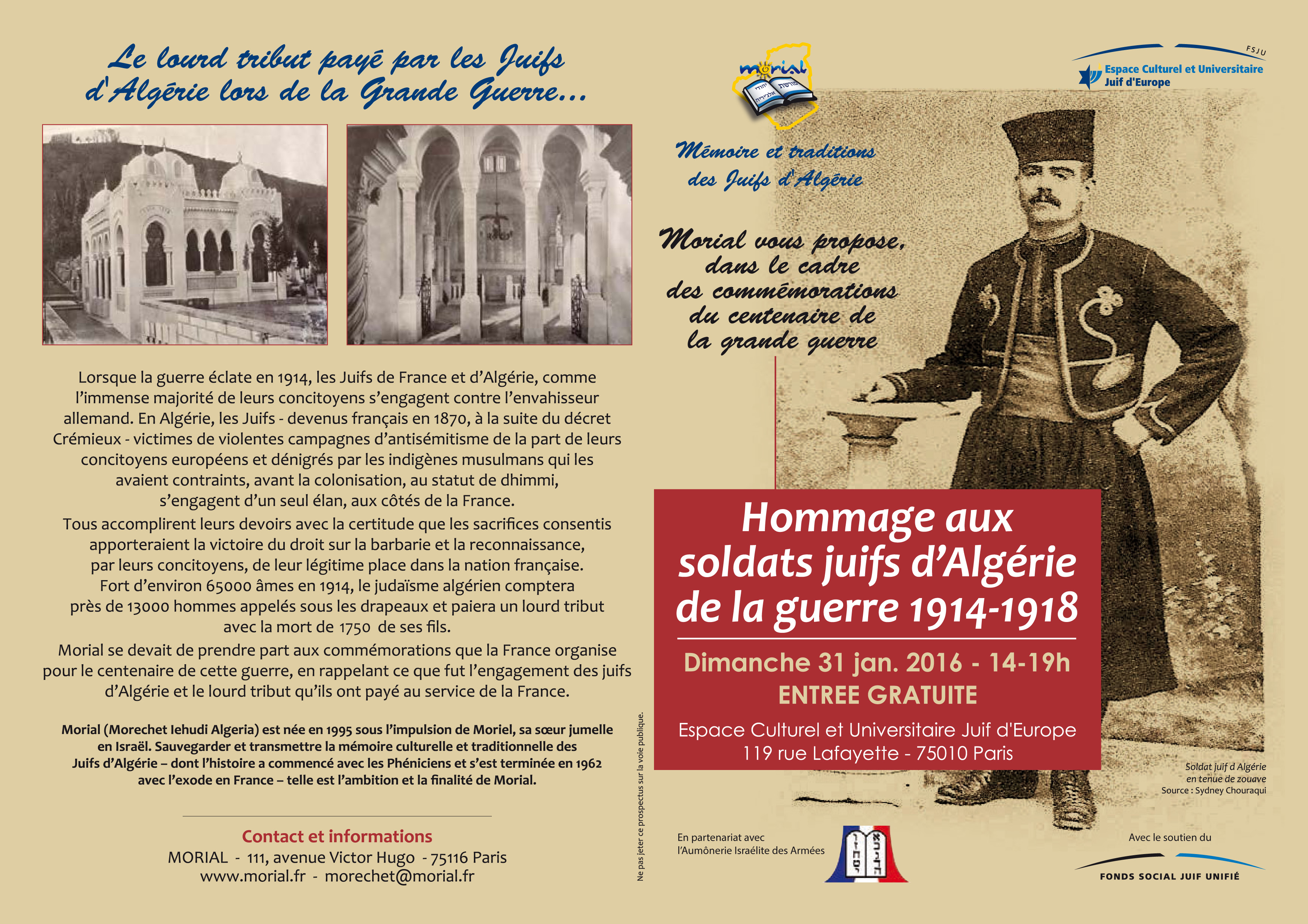 Le dimanche 31 janvier 2016 de 14h à 19h, l'association MORIAL en partenariat avec l'Espace culturel et Universitaire Juif d'Europe, avec le soutien du FSJU et de l'aumônerie israélite des armées, vous propose dans le cadre des commémorations du centenaire de La Première Guerre mondiale, une cérémonie à l’Espace Culturel et Universitaire Juif d’Europe .