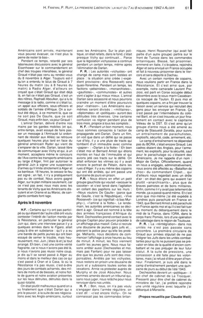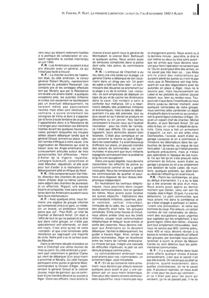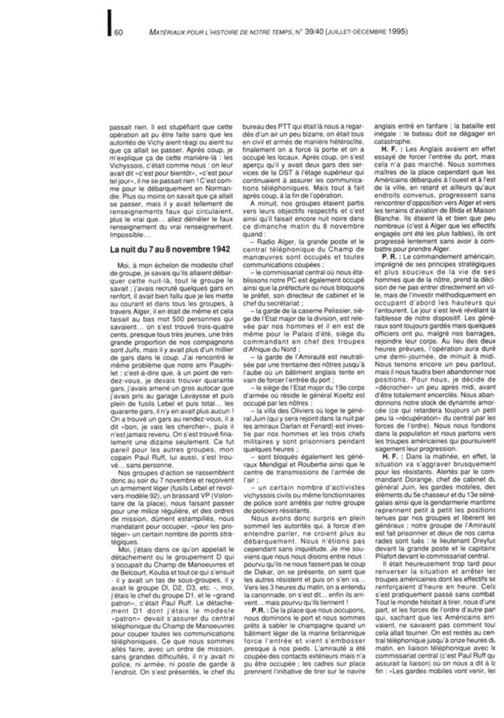 Oui Paule, vous avez raison, et comme l avait ecrit Monsieur ANANOU pour son pere qui avait participe au "coup du 8 novembre 1942" le grand malheur pour tous ces resistants qui sont restes dans l anonyma, c est qu il n y a eu que 2 morts sur les 377 participants, le Capitaine PILAFORT et le Lieutenant DREYFUS.?????