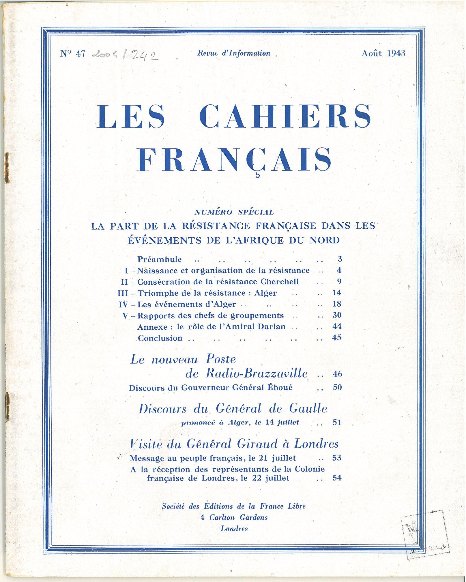 NUMERO SPECIAL : LES CAHIERS FRANÇAIS n°47 du mois d’août 1943