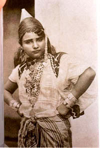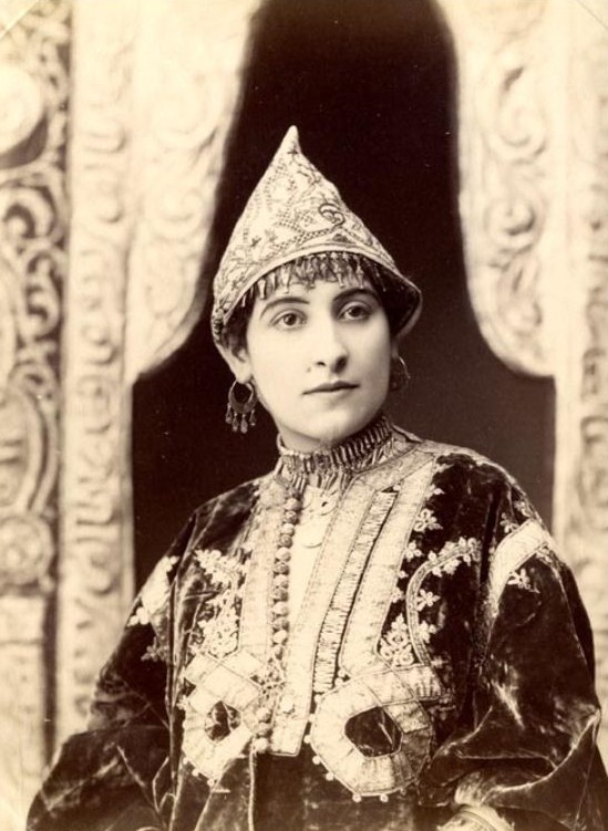 Le costume de la femme juive d’Algérie était constitué d'une coiffe en forme de cône, la sarmah, d'un benigo ou d'un foulard frangé.