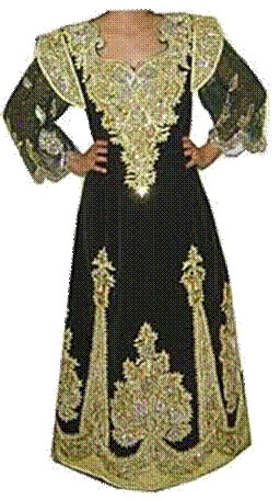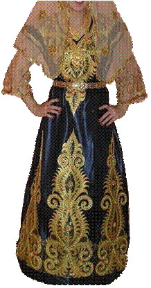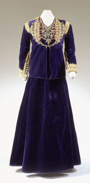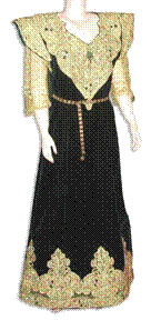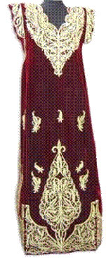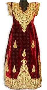 Cette robe en velour épais traditionnellement de couleur bordeaux mais parfois de couleur vert fondé ou bleu nuit est brodée de fil d’or que l’on retrouve surtout sur le plastron.