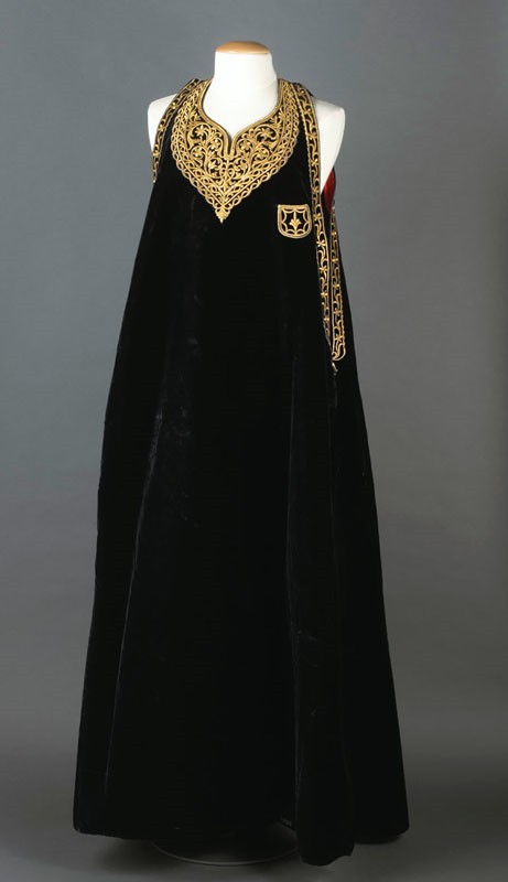 Il s’agit d’une robe longue de forme chasuble, sans manches avec une jupe évasée, en soie noire, au décolleté en forme d'écusson dont le tour comporte un plastron brodé de fils d'or représentant des motifs végétaux stylisés.
