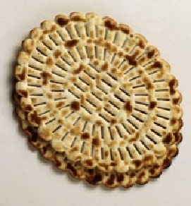 On était obligé de piler cette galette très fine pour le café au lait qui prenait la consistance du ciment, plus grossièrement pour les potages et autres usages. Le pilon de cuivre était l’accessoire indispensable pour la galette de Pessah, et le pilage une corvée partagée. A table, on laissait la galette tremper dans l’eau, comme la « soupe » des paysans de jadis, qui,  dans des maies en bois,  conservaient leur pain toute l’année.