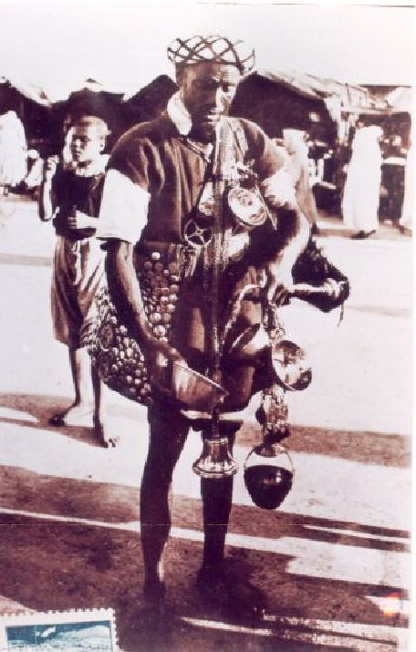 Dans la journée, des marchands d’eau arabes, agitant une petite clochette, une outre en peau de chèvre avec un bec verseur ou un robinet en cuivre sur l’épaule, proposaient à boire en arabe : « l’mé khlo ! ». Pour quelques sous, ils servaient l’eau dans des timbales semi sphériques en cuivre jaune étincelant, plus rarement en fer blanc, qui pendaient à leur épaule et à leur ceinture. Pour l’étanchéité, du goudron tapissait l’intérieur de l’outre et donnait à l’eau une odeur et un goût singuliers, comme légèrement anisés.