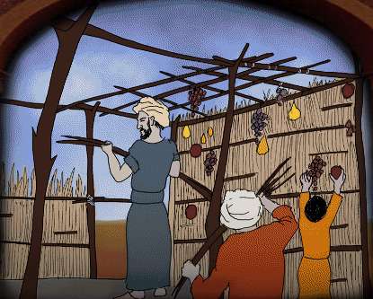 Les adultes édifiaient avec de  très longs roseaux  une grande  cabane. Les branches de palmier qui recouvraient le toit devaient laisser apercevoir le ciel : deux tiers de branchages et un tiers de ciel.