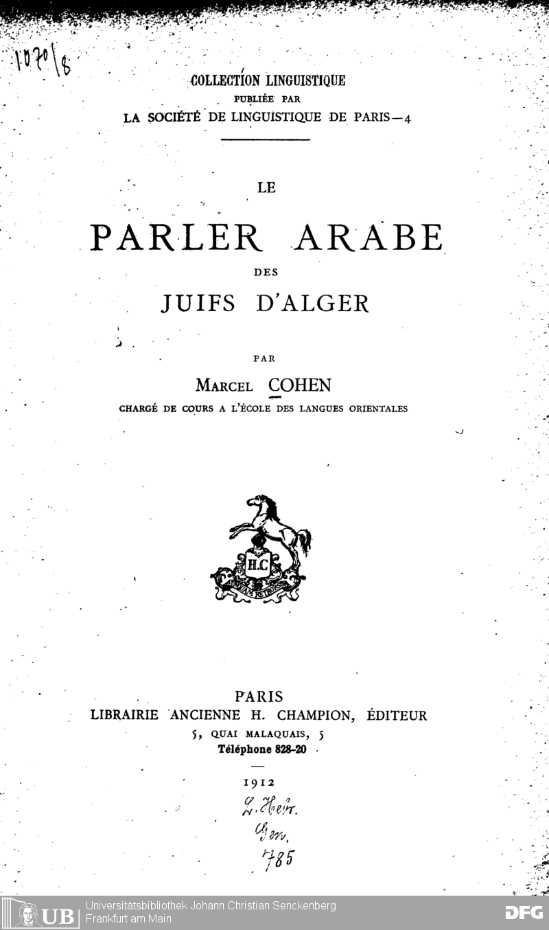 "Le parler arabe des Juifs d'Alger" de Marcel Cohen