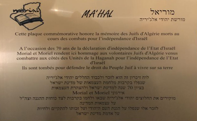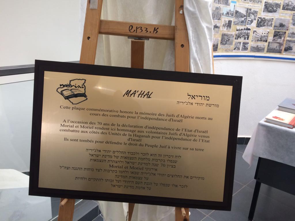Les deux associations sœurs, MORIAL, qui signifie « l’Héritage des juifs d’Algérie en France », et MORIEL qui signifie « l’Héritage des juifs d’Algérie en Israël », ont découvert ensemble, le 3 mai 2018 une plaque en mémoire des héros juifs d’Algérie qui participèrent à la lutte de libération de l’Etat d’Israël au Mémorial