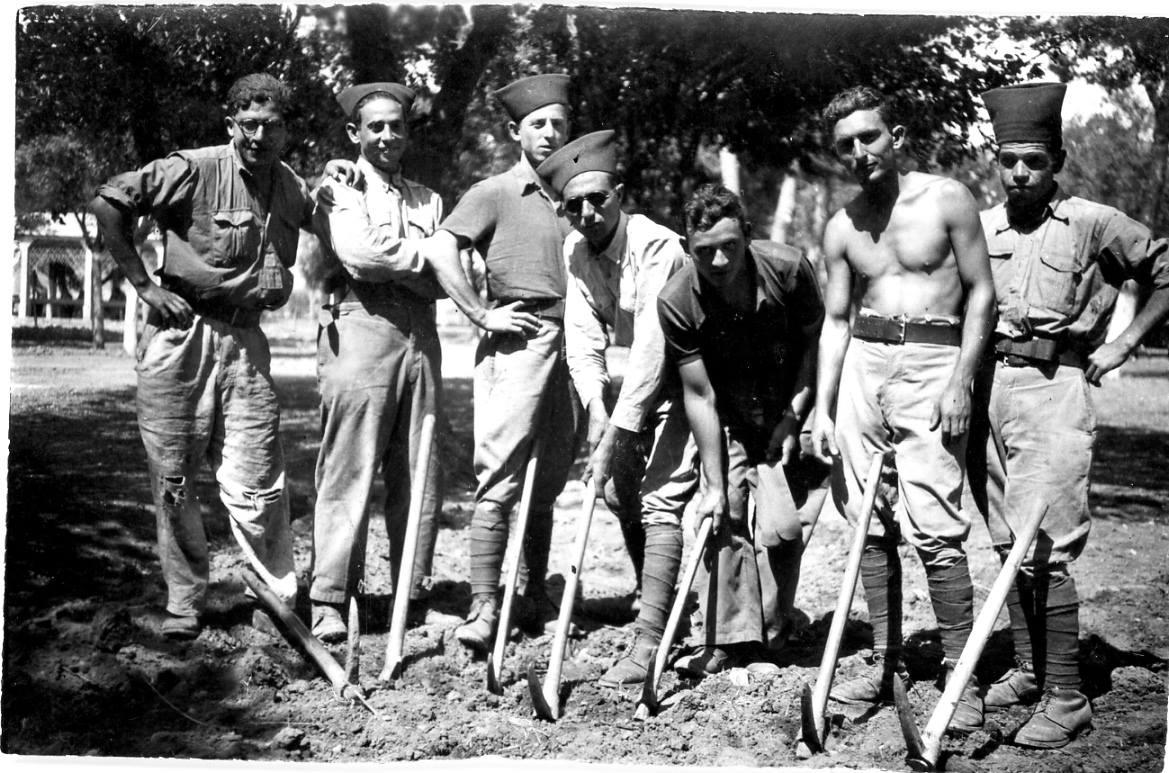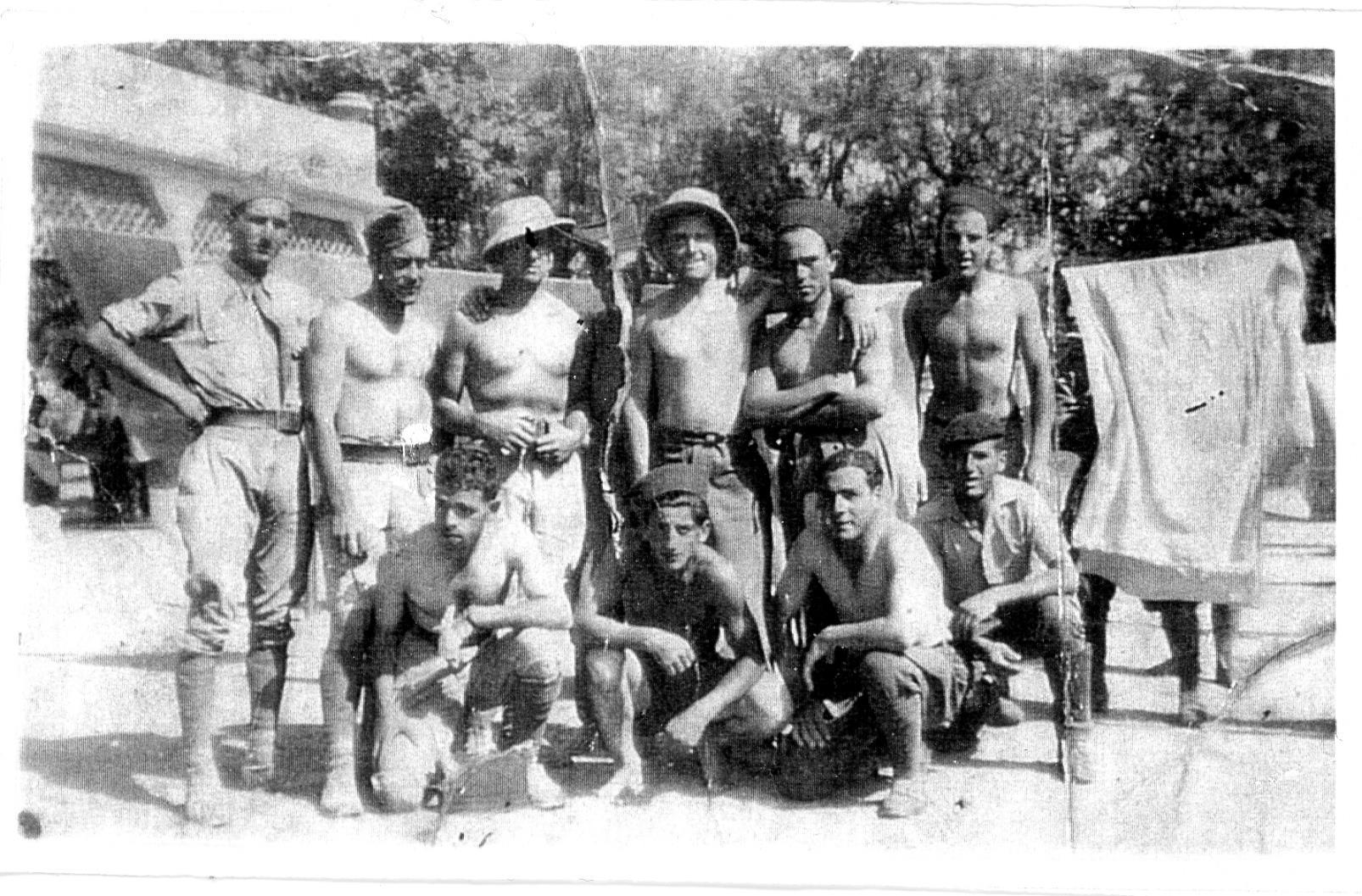 A gauche de la photo, Léon Dahan est accroupiEt en même temps pour faciliter et accélérer sa convalescence il écrivit à notre maman pour qu'elle vienne vivre avec mon frère et moi près de mon père, durant quelque temps.