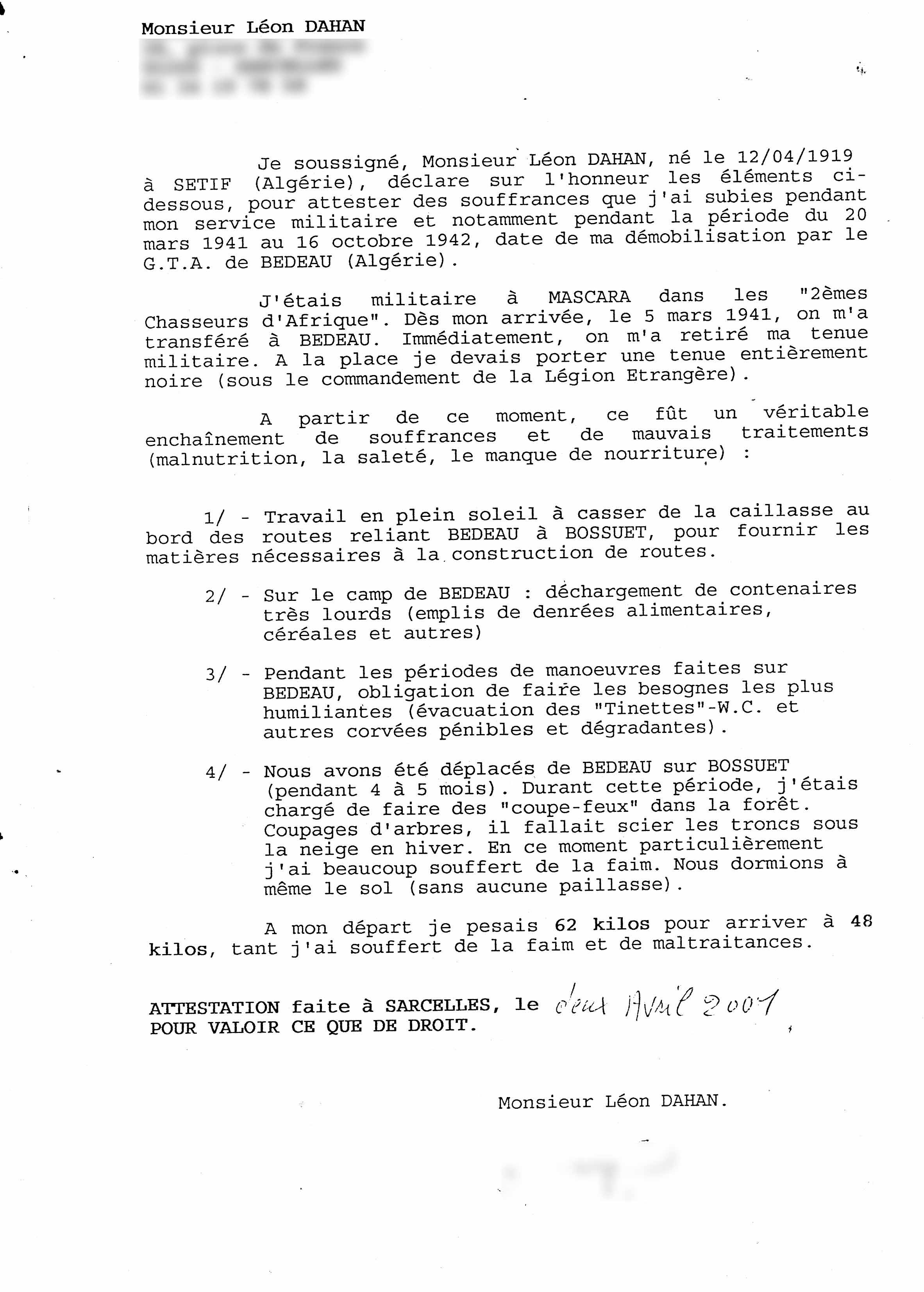 Témoignage dicté et signé par Léon Dahan sur son séjour dans le camp de Bedeau, en Algérie, durant la guerre 39-45.