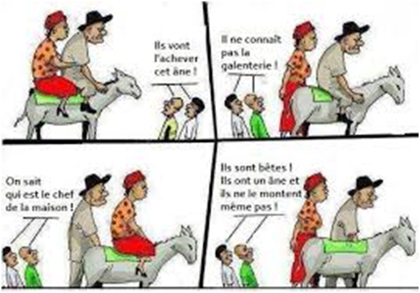 2- Avant d’atteindre un second village, le fils prit donc le soin de descendre du dos de l’âne. Ainsi, lorsqu’ils traversèrent le village, ils entendirent les gens s’écrier :