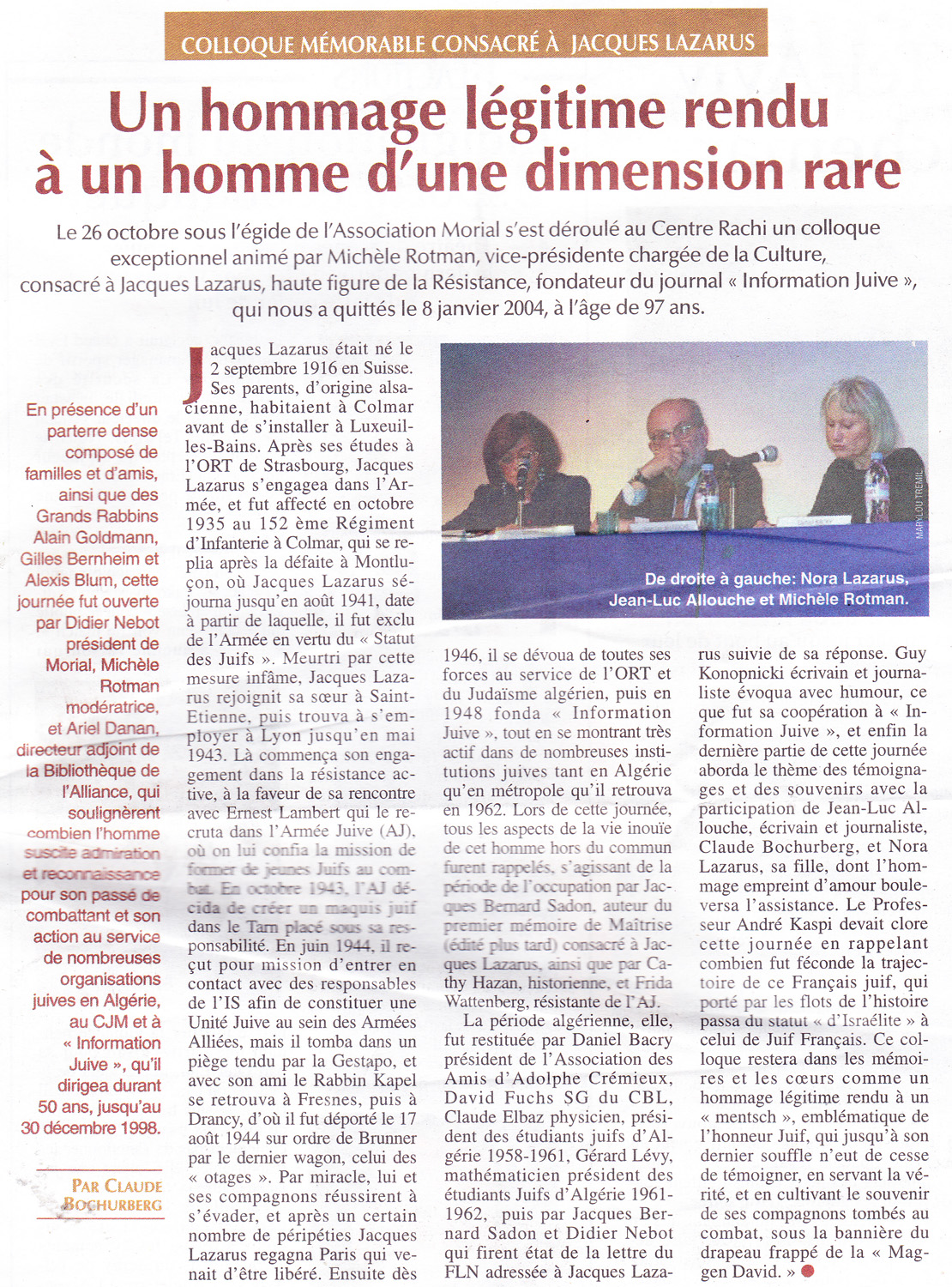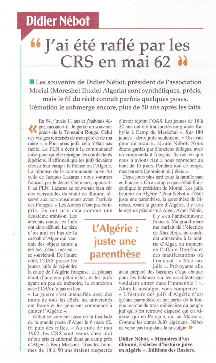 "Le témoignage de Didier Nebot est particulièrement rude, car à dix-neuf ans il se retrouva arrêté avec un lot d’activistes de l’OAS – auquel il n’appartenait pas — et enfermé dans un camp, justement à Camp-du-Maréchal où sa vie et sa santé furent en danger, lui laissant un traumatisme tel que l’auteur se consacrera plus tard à la préservation de la mémoire juive d’Algérie (MORIAL) et au secours des déshérités au sein de l’OSE. Nebot rappelle les exactions commises contre les Juifs,..."
