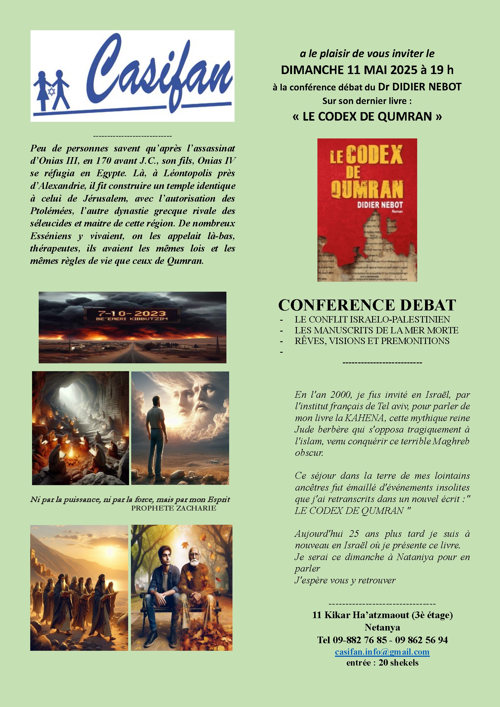 CONFERENCE DEBAT - LE CONFLIT ISRAELO-PALESTINIEN - LES MANUSCRITS DE LA MER MORTE - RÊVES, VISIONS ET PREMONITIONS
