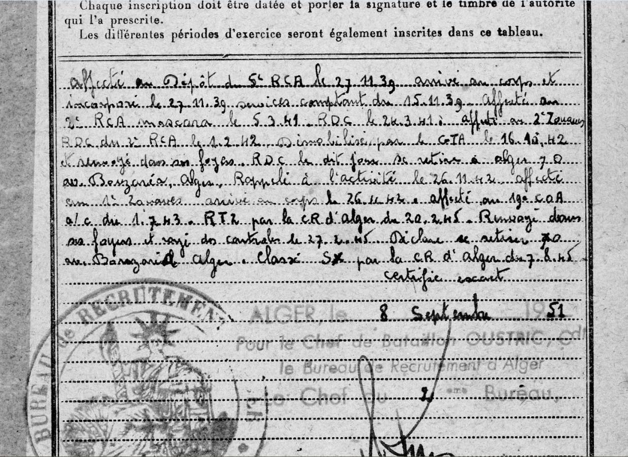 De la classe 39, appelé sous les drapeaux le 27 novembre 1939 il fut définitivement démobilisé par une commission de réforme le 20 février 1945.