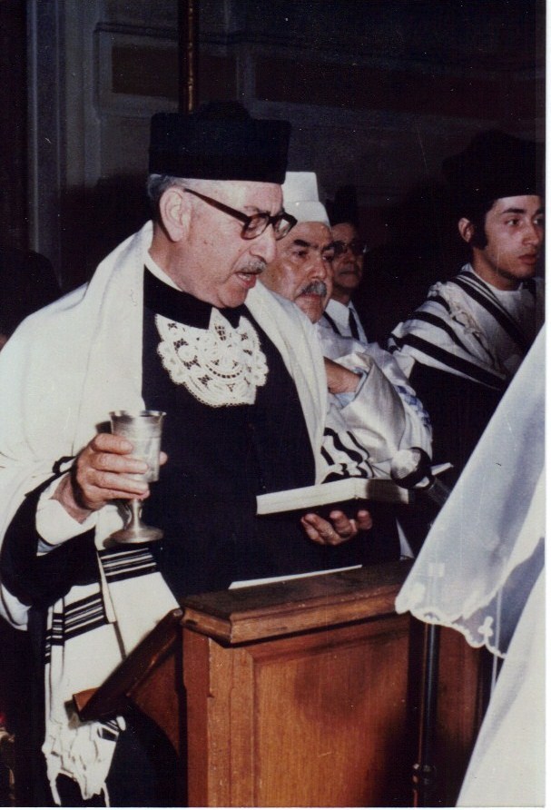 Le Grand Rabbin S. Morali et MM. Attiach et Guedj, ministres officiants à la Synagogue des Tournelles (Paris, 1974)