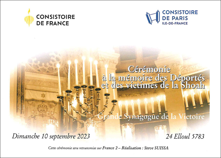 Instaurée à l'initiative du Rabbinat français, la mémoire des victimes de la Shoah est commémorée chaque année la semaine précédant le nouvel an Juif par un office solennel à la Grande synagogue de la rue de la Victoire, en présence du Représentant du Président de la République, des Autorités Officicelles et des anciens Déportés.