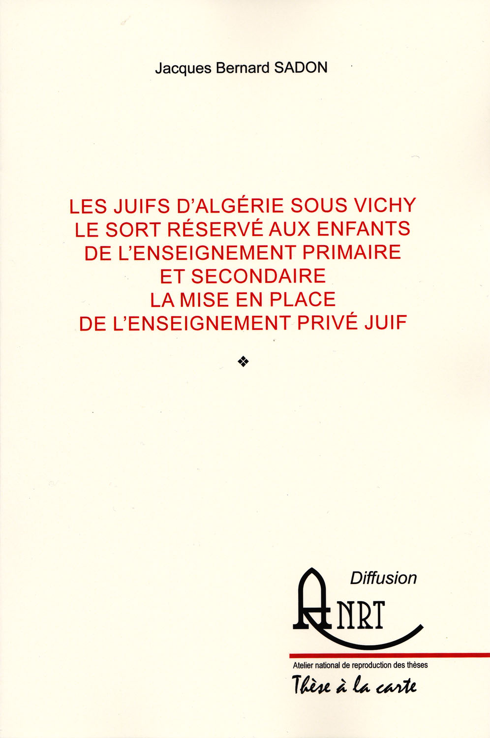 Le travail de recherche auquel s’est livré l'auteur de cette thèse de doctorat, concerne le sort réservé à la communauté juive d'Algérie durant la période 1940-1943, et plus précisément celui des enfants des écoles primaires et secondaires victimes de l'éviction scolaire instaurée par le recteur d'Alger Georges Hardy.