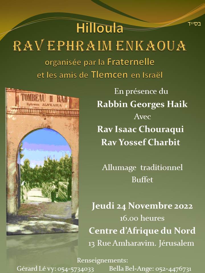 Jeudi 24 novembre 2022 à 16H est organisée la Hiloula (1e Kislev) du Rav Ephraïm ENKAOUA, par la Fraternelle et les amis de Tlemcen en Israël.