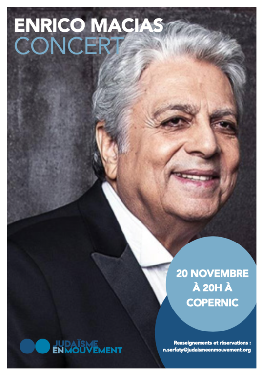 - A 20h30, Enrico Macias et ses musiciens clôtureront le premier Chabbat séfarade lancé par JEM par un grand concert acoustique arabo-andalou à la synagogue Copernic.