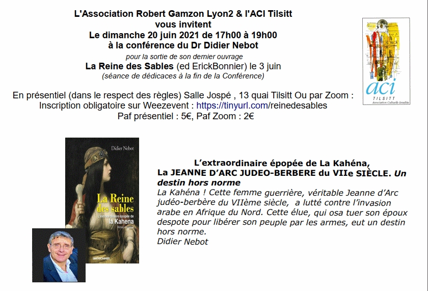 A l’occasion à la parution du livre "La Reine des Sables" de Didier Nebot aux éditions Erick Bonnier, l’association Robert Gamzon Lyon2 & l’ACI Tilsit, vous invitent à une conférence avec l’auteur.