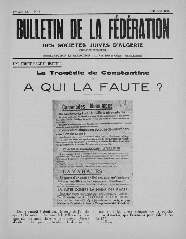 le pogrom de Constantine "Bulletin de la Fédération des Sociétés Juives d'Algérie d'octobre 1934"