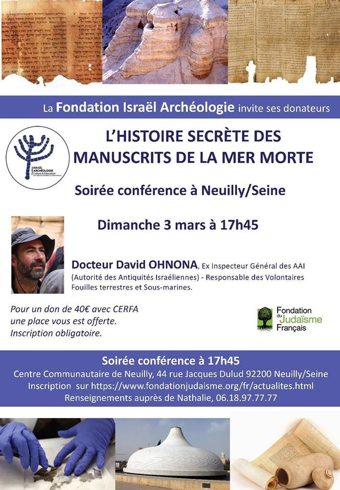 Le 3 mars 2019 à 17:45, la Fondation ISRAËL ARCHÉOLOGIE invite ses donateurs au Centre communautaire Jérôme Cahen (Neuilly-sur-Seine) pour assister à une conférence de David Ohnona, à propos de l'histoire secrète des manuscrits de la Mer Morte.