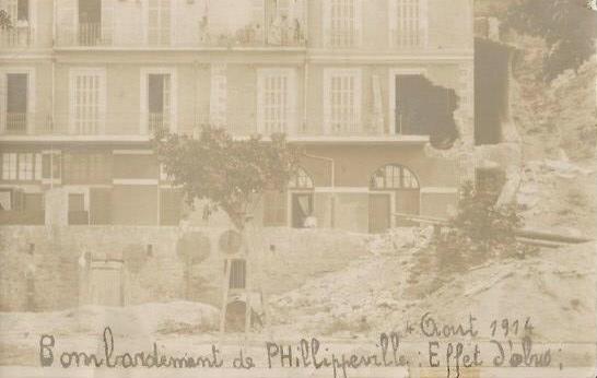 Philippeville. Le 4 août 1914 - Vers 4h30, (certains historiens placent l’événement une heure plus tard). Le lieutenant de réserve Cardot, avocat au barreau de Sétif, qui avait occupé la batterie du fort d’El Kantara la veille à 23 h, aperçoit, émergeant de la brume, un navire arrivant à grande vitesse en vue de la ville. Photo inédite : bombardement de Philippeville le 4/08/1914