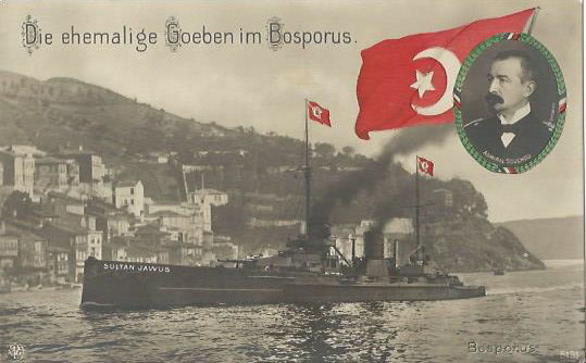 - Le 16, les deux navires, par un tour de passe-passe, sont transférés à la Turquie, alors neutre, pour éviter d’être internés, comme l’exigent les traités internationaux. L’équipage allemand, officiers et marins, se coiffe alors d’un Fez. En novembre, le Goeben et le Breslau sont officiellement cédés à la marine ottomane, et deviennent respectivement le Yavuz Sultan Selim et le Midill.