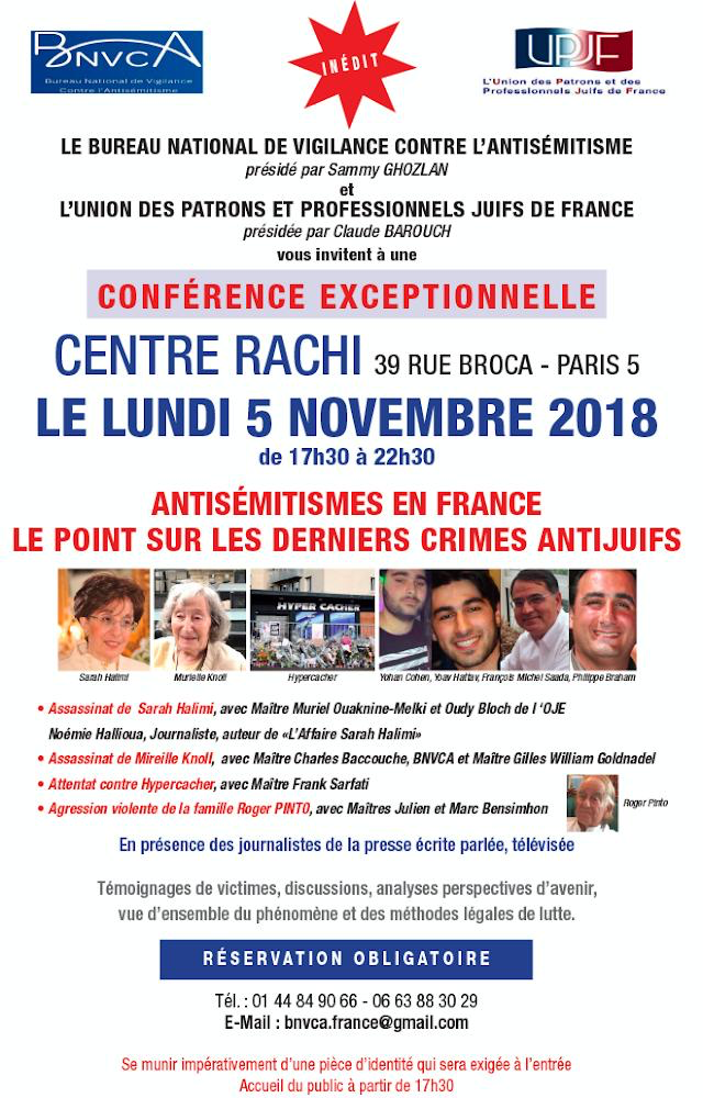 Lundi 5 novembre 2018, de 17h30 à 22h30, le Bureau National de Vigilance Contre l'Antisémitisme (BNVCA) et l’Union des Patrons et Professionnels Juifs de France (UPJF) vous invitent à une conférence exceptionnelle :
