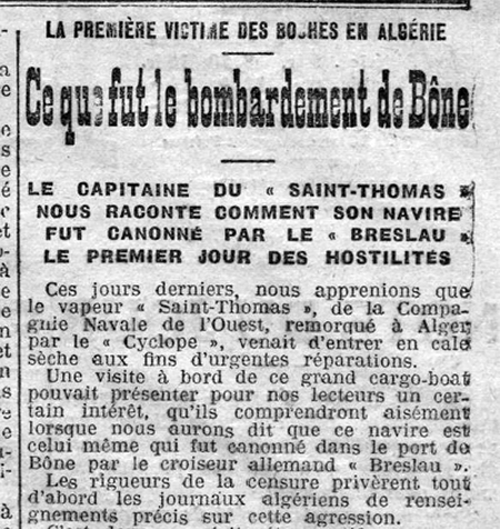 Suivent quelques lignes laconiques d’un communiqué du général gouverneur d’Alger Charles Lutaud qui précise qu’un raid de la marine allemande a été effectué par les croiseurs Breslau et Goeben et qui profite de l’occasion pour appeler à la mobilisation générale des Français d’Algérie.