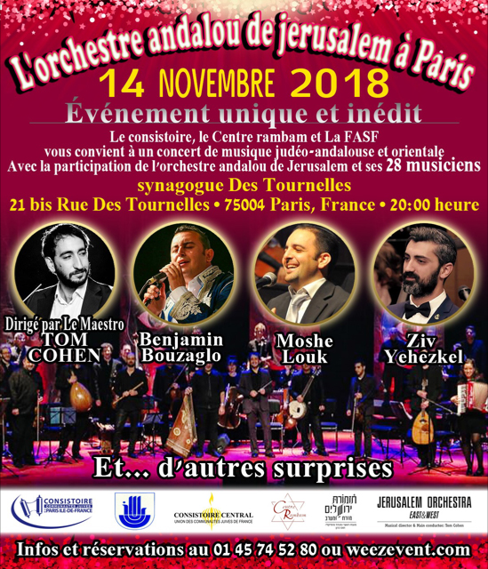 Le Consistoire israélite de Paris et de France, le Centre Rambam et la Fédération des Associations Séfarades de France présentent l'orchestre ANDALOU de Jérusalem, sous la direction du Maestro, Tom COHEN et sa formation de 28 musiciens, sublimé par de merveilleux solistes :