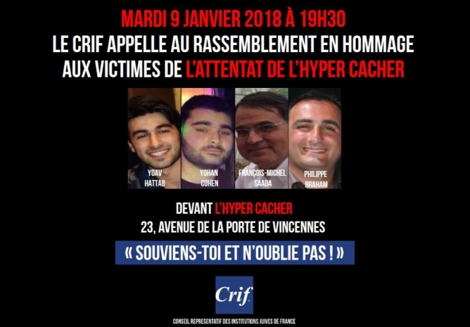 Le Crif appelle à un rassemblement mardi 9 janvier 2018, à 19h30 devant l'Hyper Cacher - 23, avenue de la Porte de Vincennes, à Paris.