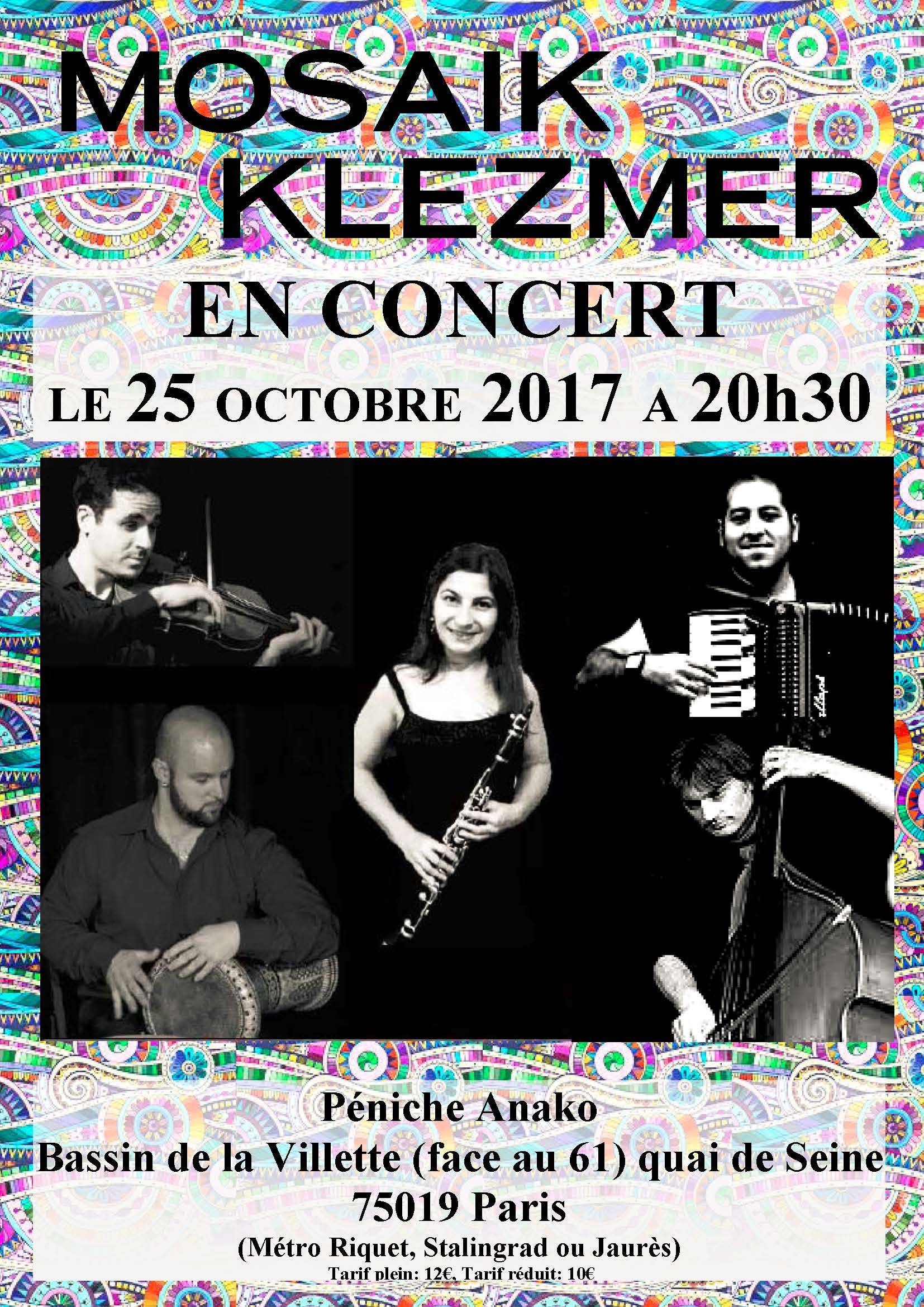 Mardi 14 novembre à 20h30 sur la scène du Centre Mandapa, le groupe MOSAIK KLEZMER propose un spectacle avec ses musiques originaires de la péninsule ibérique, du Maghreb, de l'Europe Centrale.