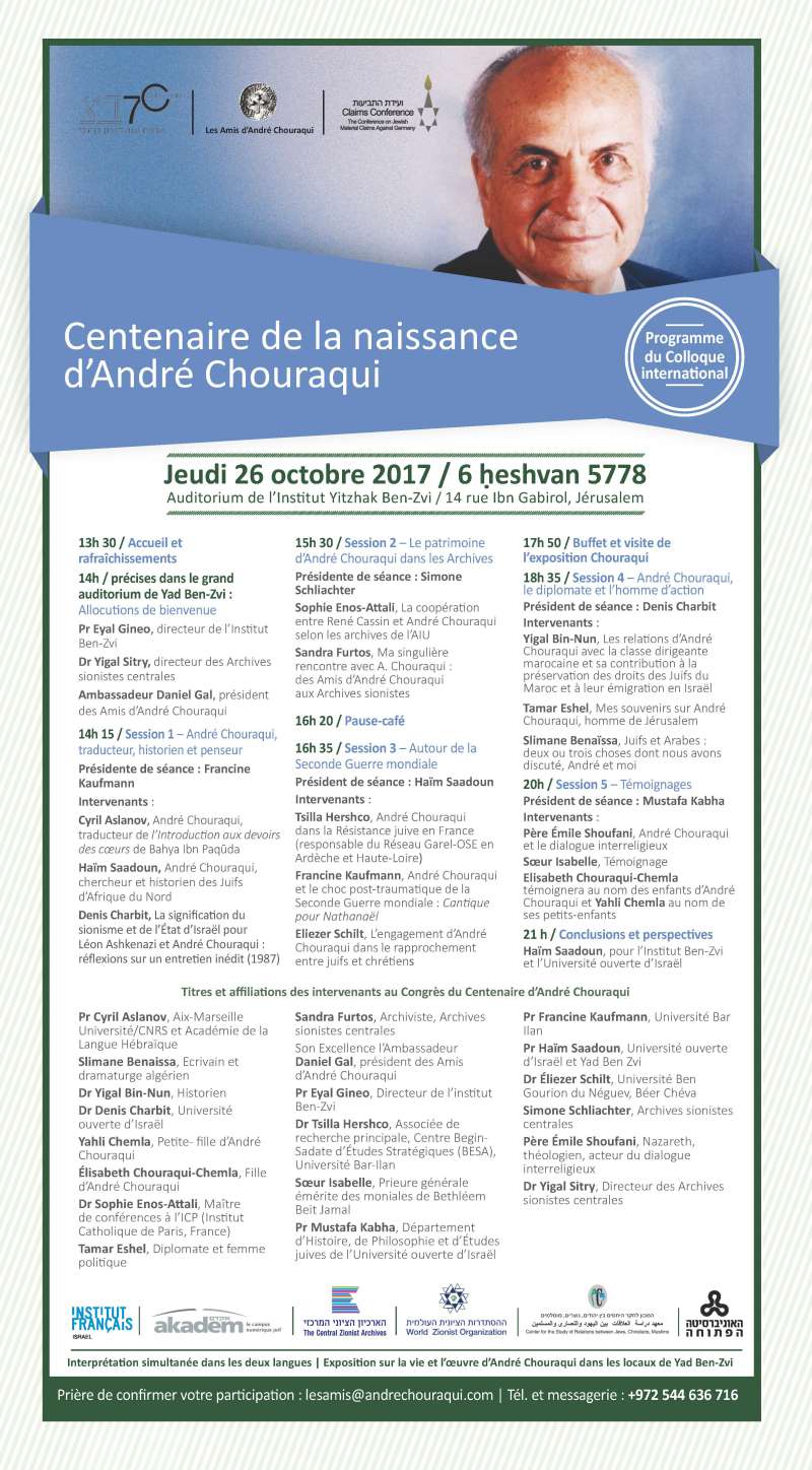 Le 26 octobre 2017 à l’Institut Yad ben Zvi à Jérusalem, est célébré le centenaire de la naissance d’André Chouraqui.