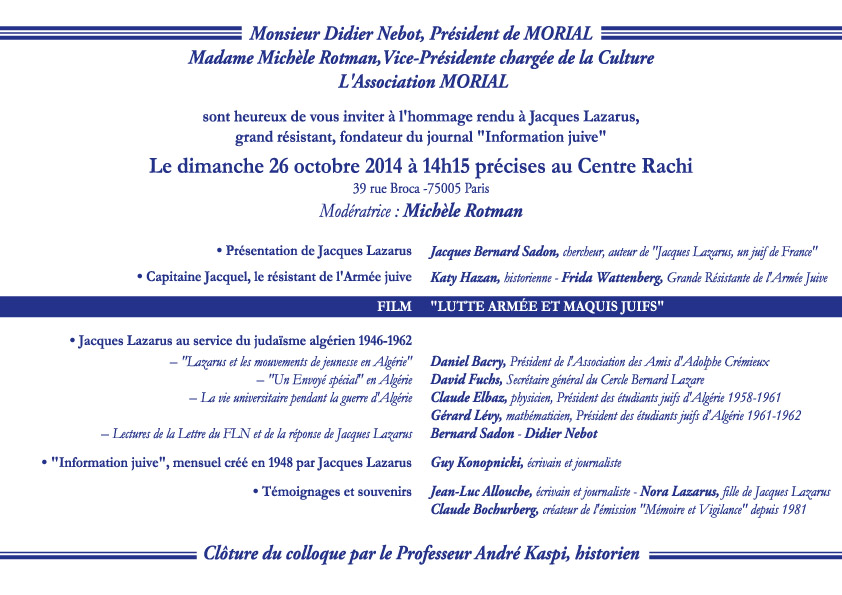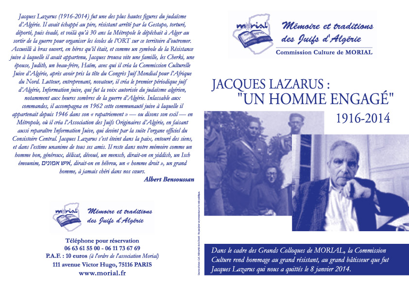 Morial associe la Bibliothèque de l'Alliance israélite universelle, qui conserve les archives de Jacques Lazarus et a participé à la mise en ligne du journal "Information juive", au grand hommage qu'elle organise le 26 octobre sur "Jacques Lazarus, un homme engagé".