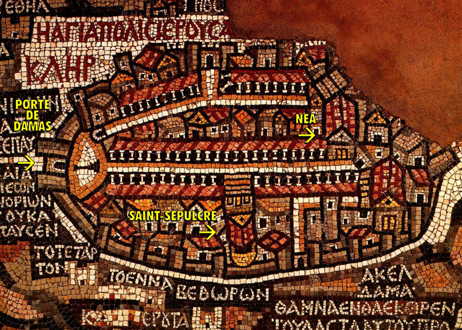 Dans la mosaïque de Madaba, on distingue clairement le Cardo, ensemble de deux allées bordées de colonnes qui débutent à la porte de Damas et traversent Jérusalem en direction du mont Sion. La Nea est située le long de l’allée Est un peu au Sud du mont du Temple. Son entrée est dirigée vers l’Ouest et fait face au mont Sion. On peut se promener au Cardo aujourd’hui et également voir la base des murs de la Nea exhumées par l’archéologue Nachman Avigad. Tout récemment, ce dernier y a découvert une inscription en langue grecque : « Dédié au très pieux empereur romain Flavius Justinien et au prêtre abbé le plus aimant de Dieu Constantin pour l’érection de l’édifice dans lequel cette mosaïque est placée durant la 14e indiction (quatorzième année de l’indiction de 15 ans). » Une inscription similaire a été trouvée près de la porte de Damas.