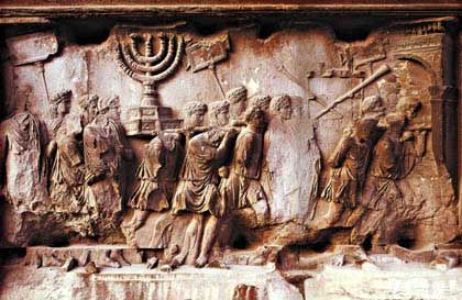 Fresque sur l’arc de Triomphe de Titus à RomeL’un des monuments les plus visités au forum à Rome est l’arc de triomphe de l’empereur Titus consacré par son frère Domitien pour marquer la prise de Jérusalem en l’an 70. On y trouve l’inscription : « Dédié par le Sénat et le peuple de Rome à Titus Vespasien Auguste, fils de Vespasien. »