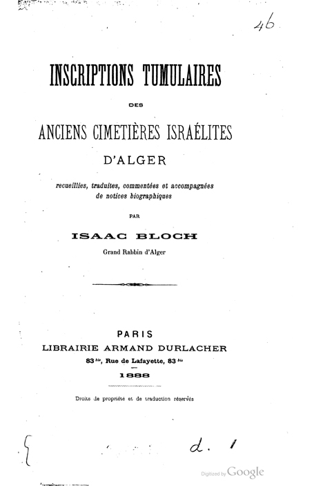 Par le grand rabbin d'Alger, Isaac Bloch, historien et gardien de la mémoire juive algérienne