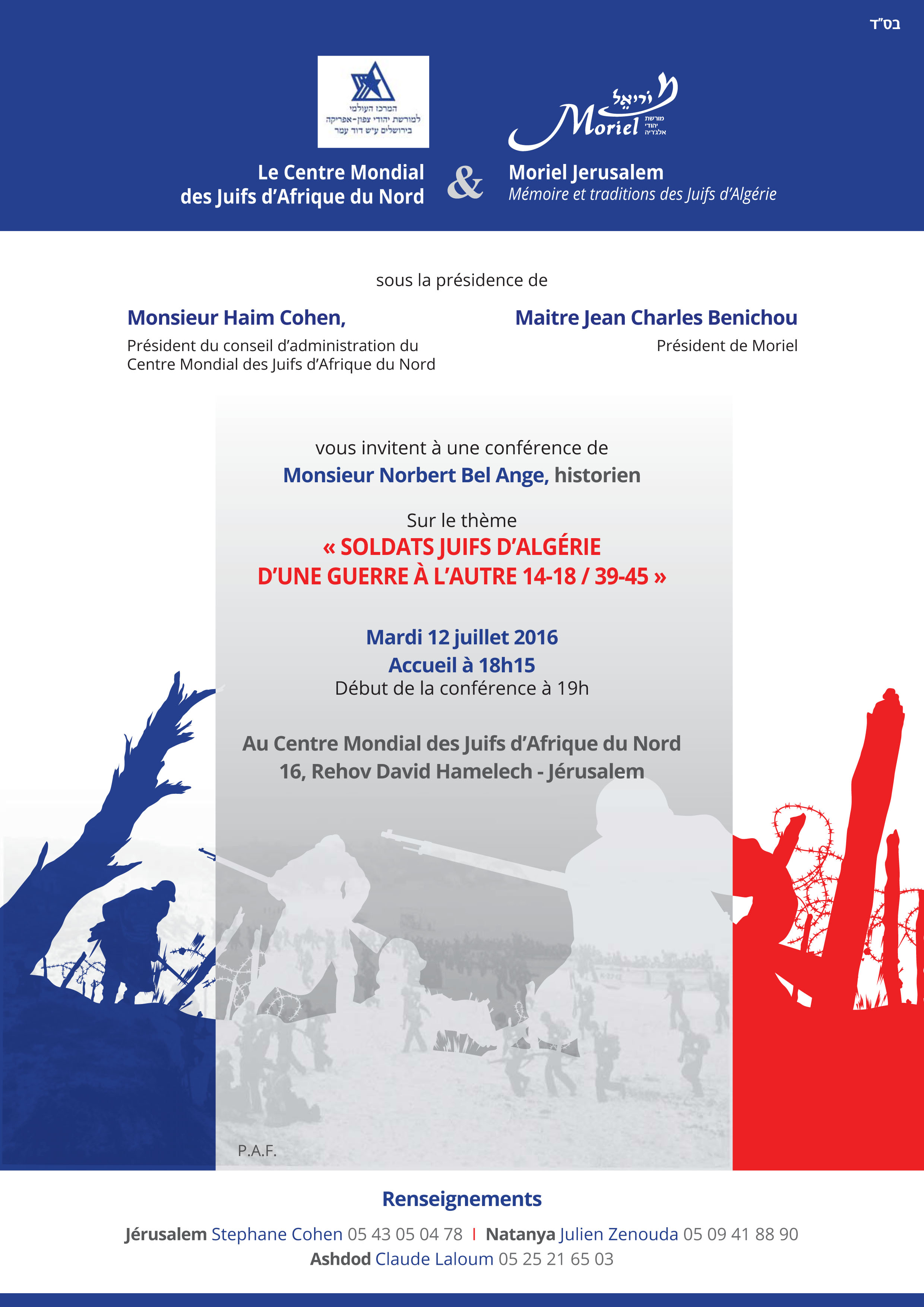 Il est un peu plus de 18 heures, cette magnifique maison du Judaïsme Mondial d’Afrique du Nord bruit doucement. Certains se rafraîchissent, d’autres prient, d’autres encore découvrent ce magnifique écrin restauré avec respect dans la belle tradition de l’architecture marocaine. Il fallait un tel lieu pour « recevoir » la mémoire des soldats juifs d’Algérie durant la Grande Guerre (1914-1918). Et celle des soldats juifs d’Algérie lors de la Seconde Guerre Mondiale.